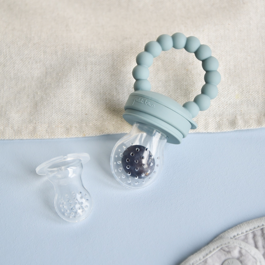 Astuce de parent : ajoutez un fruit frais ou un petit glaçon de lait maternel dans la grignoteuse.